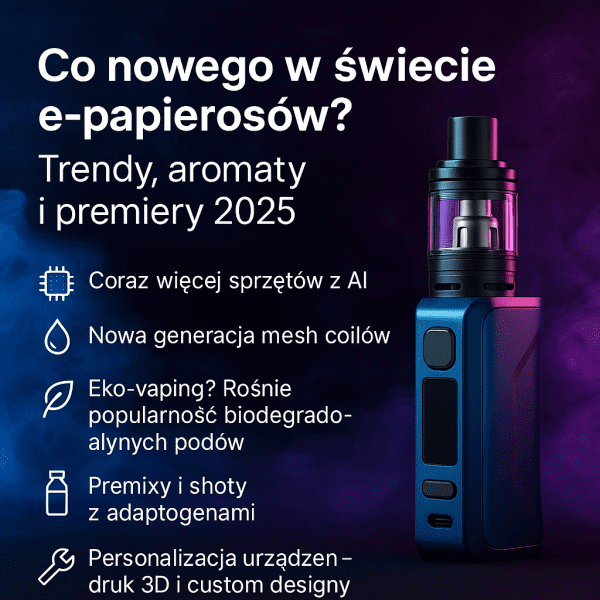 Rok 2025 dopiero się rozkręca, ale branża vape nie zwalnia tempa. Nowe urządzenia, świeże aromaty, innowacyjne liquidy i coraz większy nacisk na jakość – wszystko to sprawia, że użytkownicy mają w czym wybierać. Zobacz, co aktualnie dzieje się w świecie e-papierosów i jakie trendy warto śledzić!